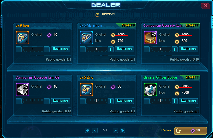 如何判断应该买哪些物资其实很简单,就是看折扣,如果你刷到50%OFF甚至以上的折扣,请毫不犹豫的购买,这肯定划算,而20%的OFF就请自行判断,如果是NA或MG就可以考虑,其它资源就不划算了。还有就是有些是要IC售卖的,IC多的玩家可以考虑在高百分比OFF情况下购入,非付费玩家主要考虑用星际货币兑换,所以建议无论何时,手中尽量保留1万以上的星际货币,用于在DEALER里购买物资。比如下图中的LV3 AI(我只买了它,因为有50%的折扣,哈哈),就应该买入,肯定不会亏本。
