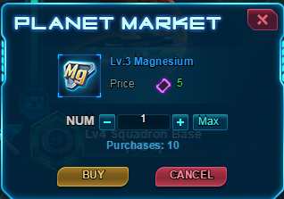 最后再说个小彩蛋,当飞船停留在己方占领的SQUADRON BASE上,能使用PLANET MARKET功能购买额外的贸易物资,当然这里购买是没有折扣价的,不过却可以使用金属、水晶和二锂来兑换,如果资源很多的话不妨考虑多留意SQUADRON BASE上刷新的物资(每隔一段时间会换,如果不满意可以下次再来)。如下图: