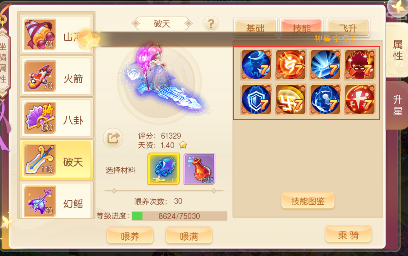 主流物理坐骑【撕裂、博观、反攻、明查、破军、流血不止】其他技能格根据自己的需求学习技能