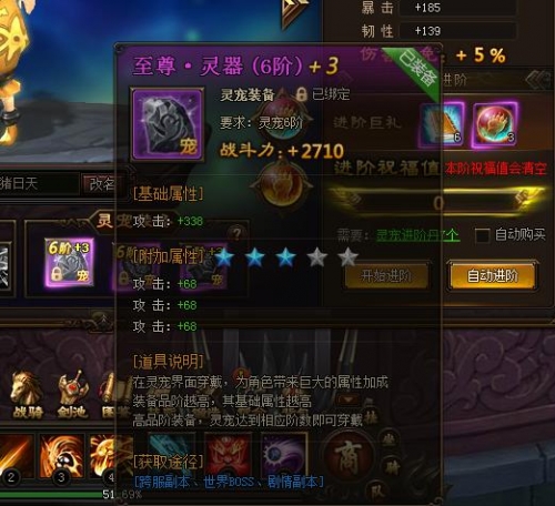 (2)灵宠进阶需要消耗:“灵宠进阶丹”。该道具可通过声望奖励,灵宠岛副本等方式获得。