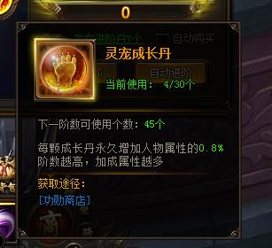 (1)灵宠达到3阶后,将可以喂食成长丹,成长丹可以百分比增加灵宠的进阶属性;