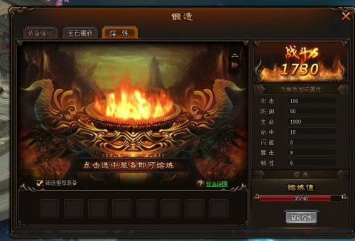 3)单击熔炼物品栏中的装备,熔炼后将获得对应熔炼值;让熔炼值满时,可获得永久属性加成。