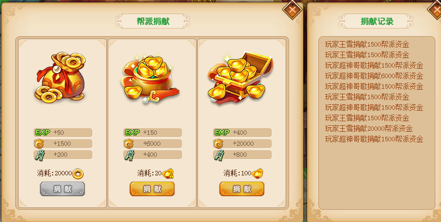 2. 帮会可以消耗铜币、绑元或者元宝进行捐献,捐献可以增加帮派资金,帮派经验和获得一定的帮贡,帮派经验可以帮助帮派升级,帮派资金可以用来提升帮会科技,帮贡可以在商店兑换一定的道具。