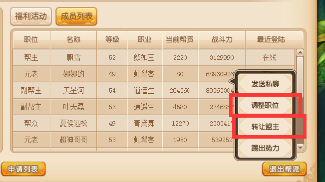 6. 帮主可进行职位任命,踢出帮派成员,帮主只有转让盟主后才可以退出帮派。