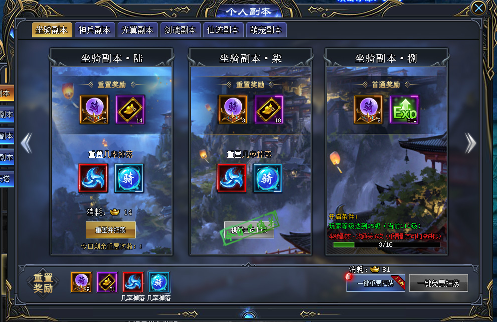 材料副本包括:坐骑、光翼、神兵、仙迹、剑魂、阵法、炼气、萌宠副本,每个副本又分为壹、贰、叁……共九个等级,每天每个副本可进入1次。挑战后消耗元宝可重置并扫荡,并返还绑定元宝。由于难度系数的不同,开启件也跟玩家的等级有关。
