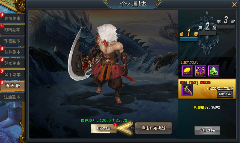 通天塔不仅产出各职业武器,还有大量经验!通关通天塔,可以让我们的战力迅速提高!通过之后,还可以一键扫荡至历史最高层,获得大量奖励!