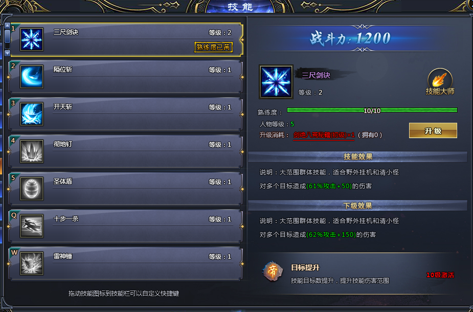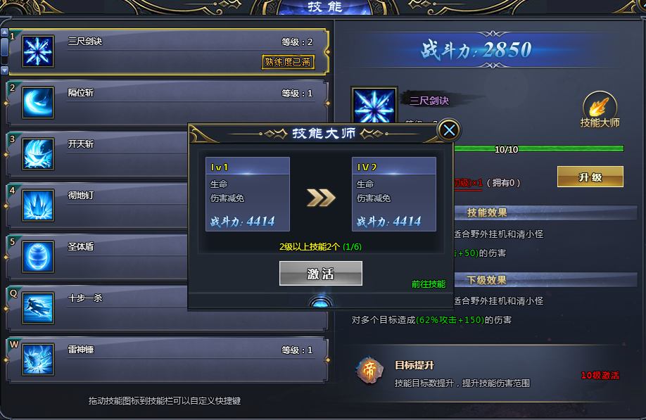 当技能等级达到一定要求时,我们还可激活技能大师,更进一步加强我们的战斗力!