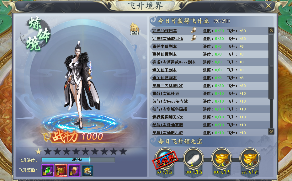 参与每日游戏活动即可获得飞升积分,不仅可以得到全面属性加成,元宝、装备、材料也一应俱送!越升越强,越强越升!