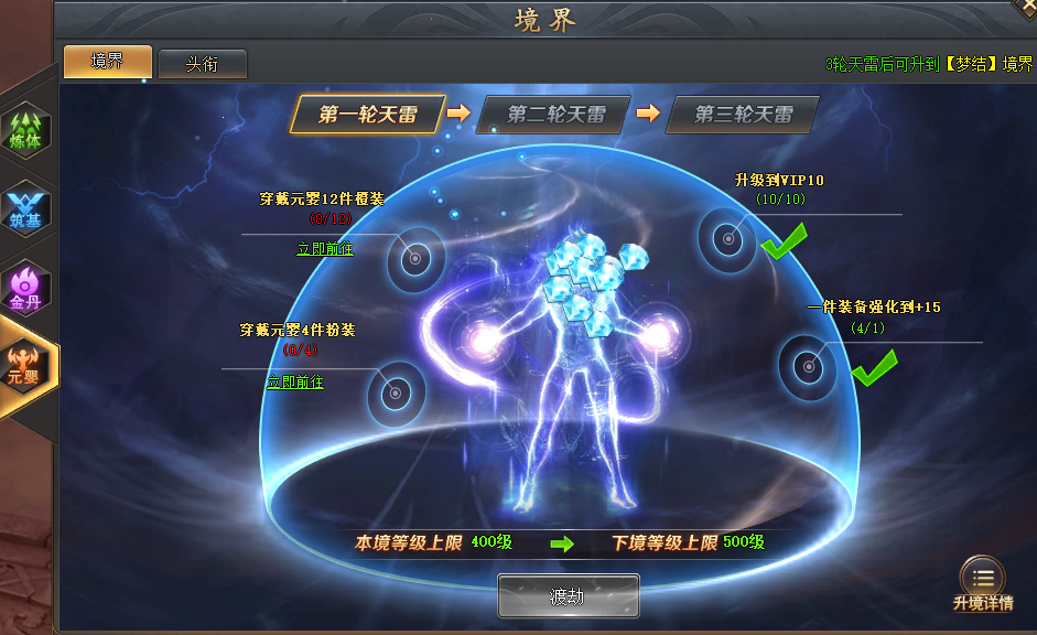 ② 炼体境界有1轮天雷任务,其余境界都有3轮任务,每轮共4个任务,完成任务会获得钻石/境界凭证(升级头衔)