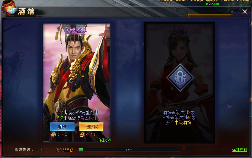 1. 欢迎来到伙伴酒馆,在这里你可以进行伙伴招募,收获全新的强力伙伴。2. 单次招募消耗“招募令”可获得伙伴碎片或完整伙伴。