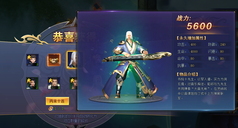 3. 十连招募消耗“十连招募令”,将必定获得一个完整伙伴。