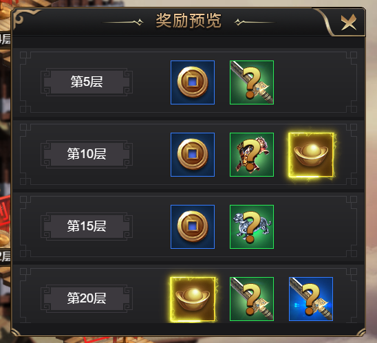 1.千重楼每层掉落铜币,每五层掉落随机装备、每十层掉落元宝;