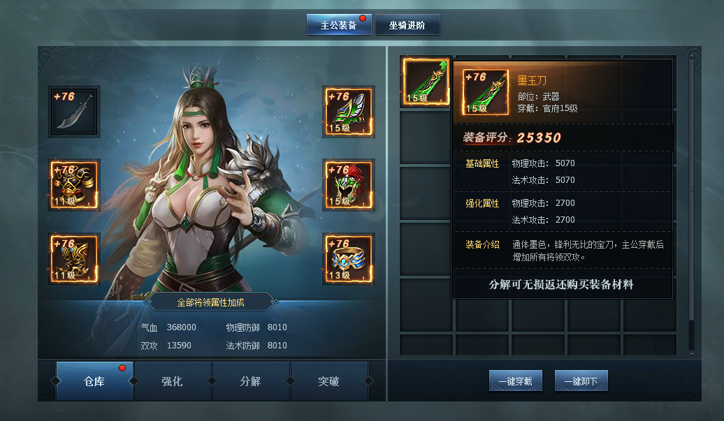 为了提供给玩家更多丰富的战力提升途径,设计了主公装备系统。
