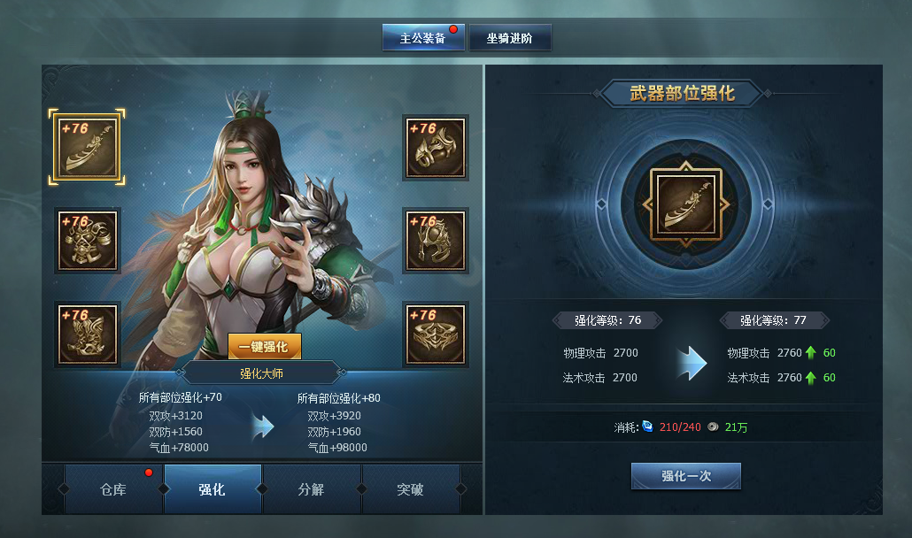 3. 装备部位强化:装备共有6个部位,包括武器、护手、铠甲、头盔、腰带、战靴。在装备强化界面强化装备部位后,穿戴上装备将提供额外的属性加成。