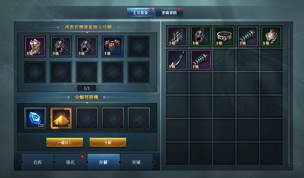 4. 装备分解:可以将自己用不上的装备进行分解,获得装备强化石。高品质的装备分解更有可能获得珍贵的装备精华,装备精华可用于商店中兑换紫装、橙装。