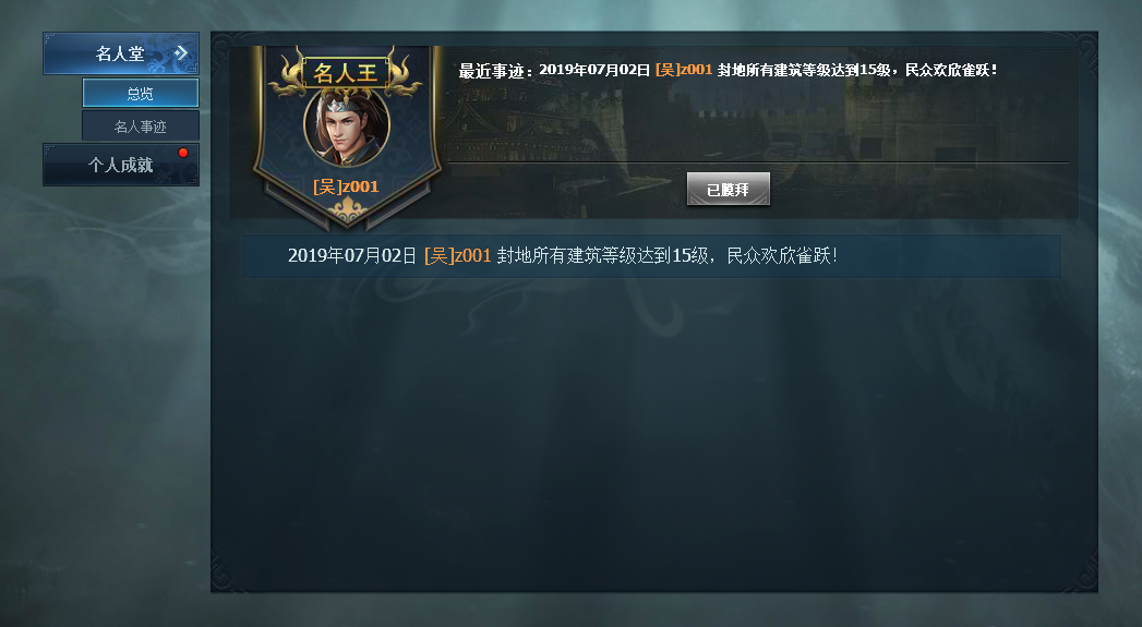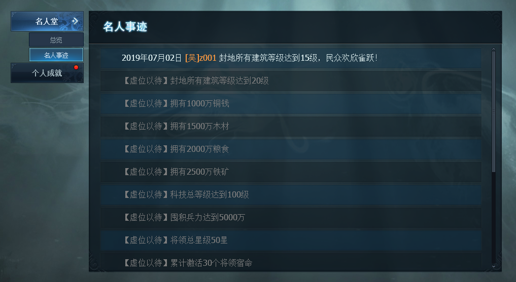 1. 名人堂:名人堂记录了本区服中率先完成伟大名人事迹的玩家,完成名人事迹最多的玩家将被称为名人王。每个玩家每天可以膜拜1次名人王,获取奖励。