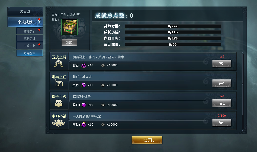 2. 个人成就:个人成就中,记录了玩家自己在游戏内达成的各个目标、成就,每次完成都可领取成就点数和铜钱奖励。成就点数达到指定值,即可领取整将奖励。成就点数还能用来升级官印。