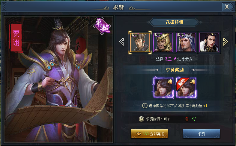 4. 求贤奖励:求贤结束后,可获得大量求贤将领对应的将魂碎片。选择与求贤将领有宿命关系的将领出访能获得更多的碎片奖励。