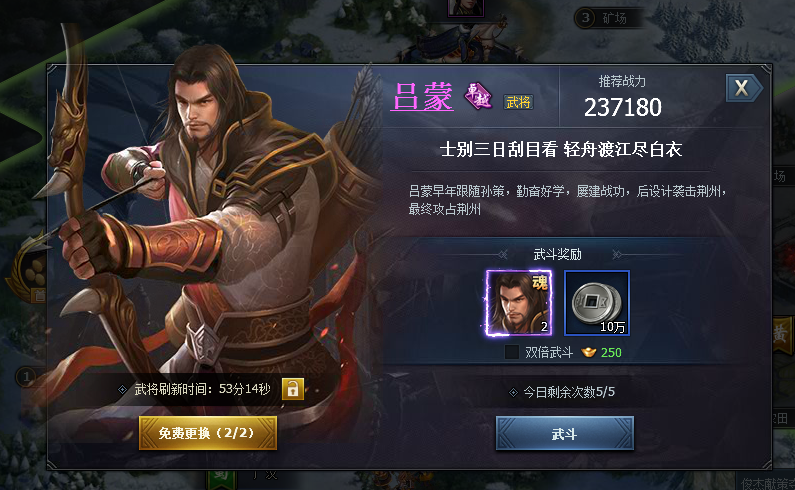 3. 武斗奖励:武斗胜利可获得该将领的将魂奖励,选用双倍武斗更可获得双倍奖励却只需消耗1武斗次数。