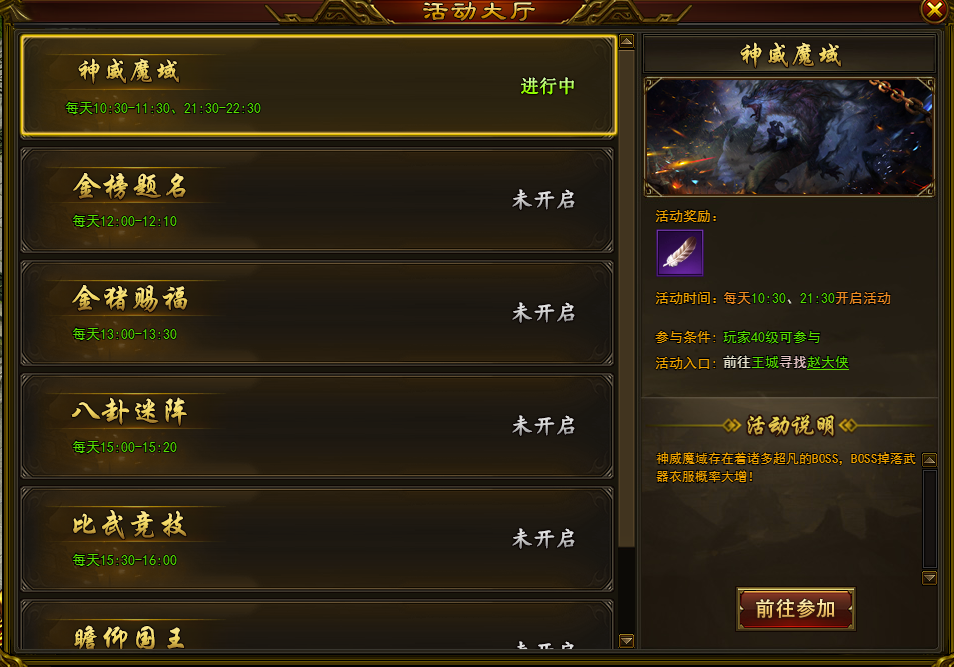 5. 活动开启60分钟,魔域将强行关闭,仍在其中的玩家将被强制传送回城。