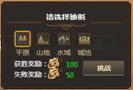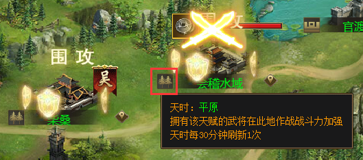 在每个战斗场景中,相应的地形会影响武将的战斗力,橙色级别武将持有在不同地形下战斗加强的天赋。天气暂时分为平原、山地、水域、城池。武将在不同的地形下进行战斗,战斗力会有相应的变化。世界地图上的城池地形在特定的时间段会随机进行改变。把握好天时可以决定一场战斗的胜利。