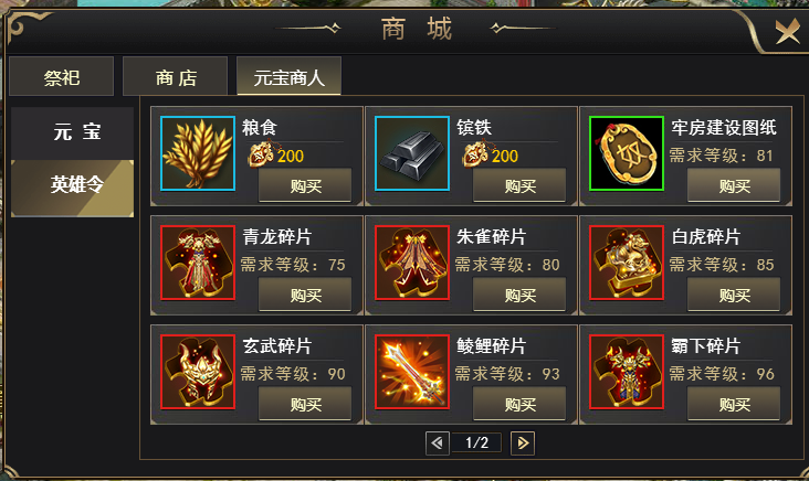 :可在功勋宝箱、竞技场获得,可以买粮食,买锭铁,买图纸,后面还能买套装碎片