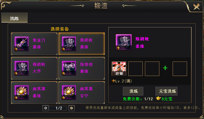 使用洗练重新生成装备上的技能,免费洗练每1小时增加1次,最多12次,次数不够时也可以用元宝洗练。