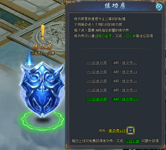 进入练功房需要消耗练功券。每日上线可免费获得练功券,通过完成每日必做可额外获得