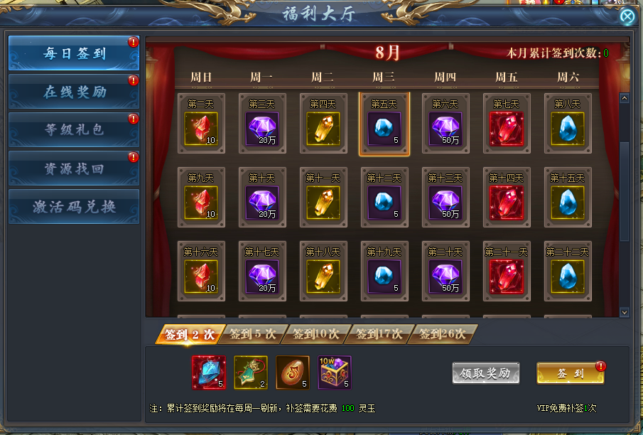 忘记签到时,可花费灵玉补签。VIP玩家可免费补签。