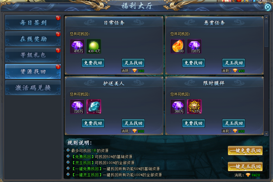 当日错过的活动,通过资源找回玩家可以找回未完成日常活动的奖励。