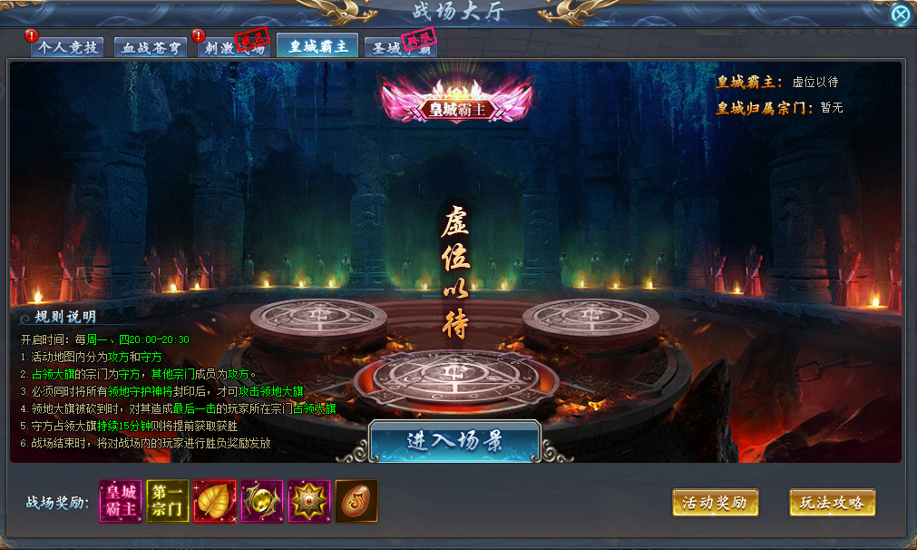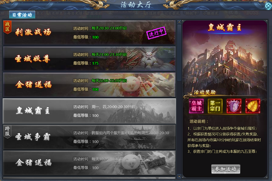每周一,周四定时开启【皇城霸主】活动,以宗门形式争夺皇城归属权。