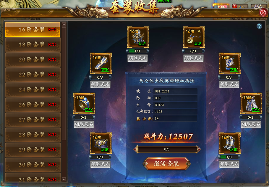 当同一阶套装收集的8个部位全部激活后即可激活套装并获得属性加成