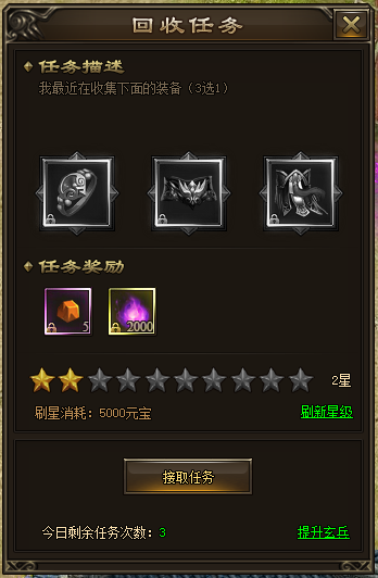 回收任务在主城75,160处接取,接取任务后需要收集任务NPC给出的三件中的任意一件可完成任务,任务星级会影响任务奖励,星级越高,奖励越好,刷新任务只需要消耗元宝