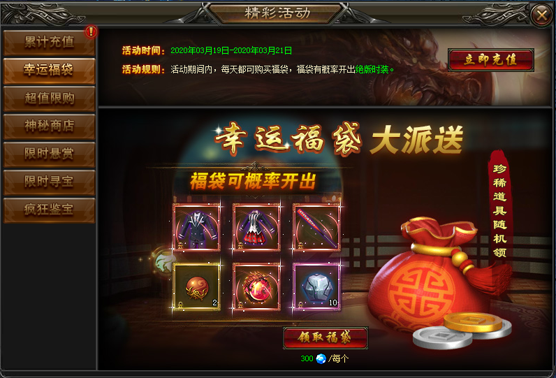 规则:可花费钻石购买福袋,每个玩家每天最多可购买30个。