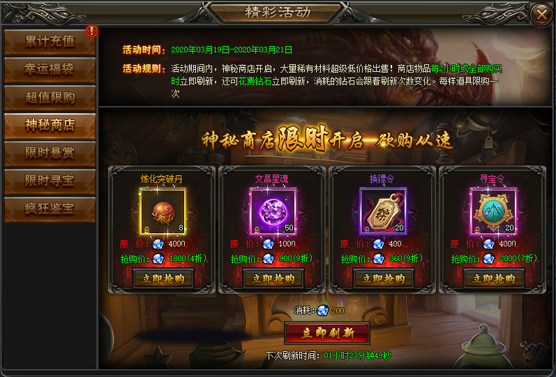 规则:每隔2小时神秘商店将会刷新各种市面上难以获取的珍贵物品