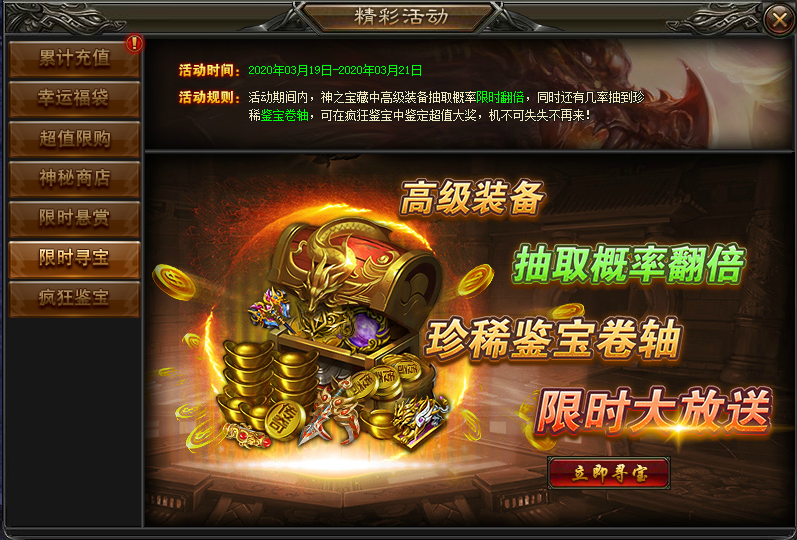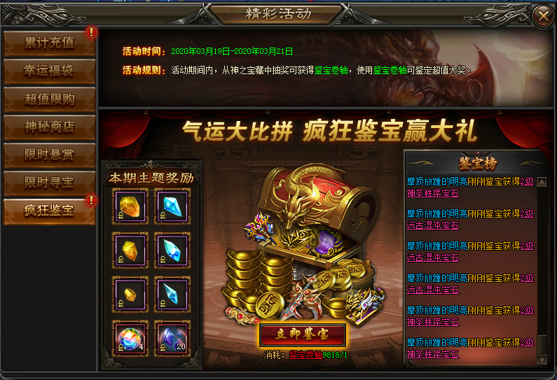 规则:活动期间,神之宝藏中高级装备寻宝概率翻倍。同时,还有几率抽取珍稀鉴宝卷轴。鉴宝卷轴可在疯狂鉴宝中鉴定各种大奖