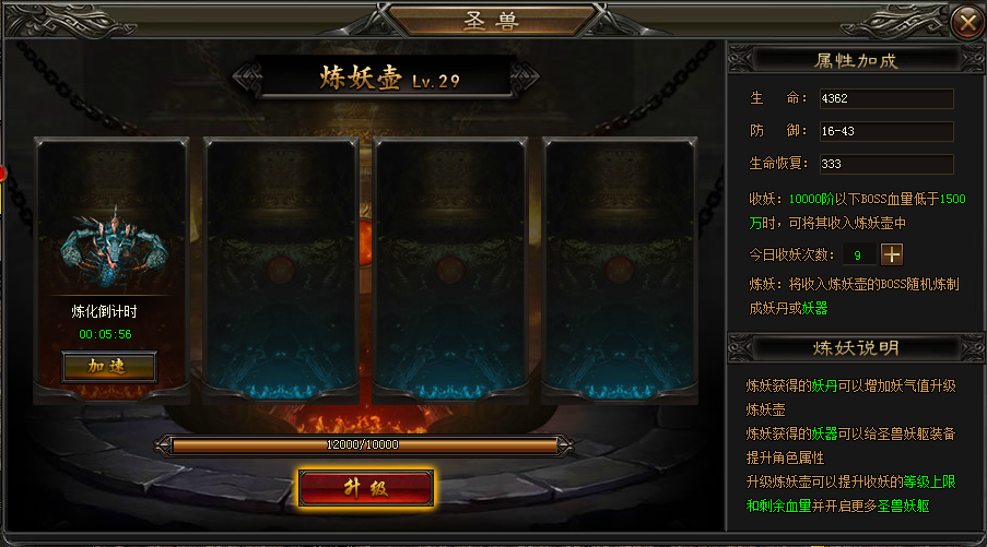 炼妖系统开启后,角色可以将BOSS收入炼妖壶中