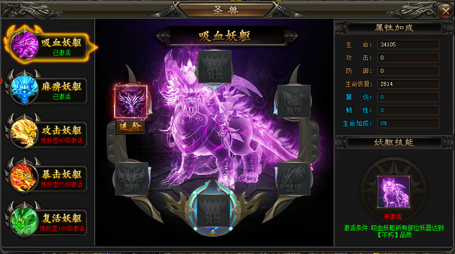 穿戴妖器可以提升角色的各项属性,并且成套的妖器还会激活妖躯技能,将圣兽的属性加成到角色身上
