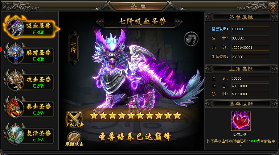 游戏中一共可以获得5只圣兽,圣兽通过VIP等级激活,VIP只需要完成任务即可免费升级
