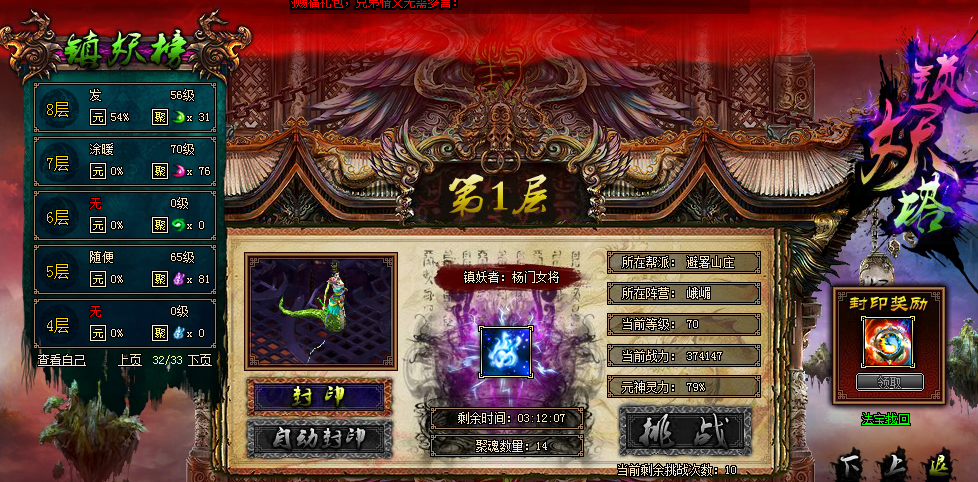 玩家到达40级时就可以开启锁妖塔啦,锁妖塔系统的推出是在于给玩家一个能够挑战极限的战场,会掉落装备注灵(炼器-装备注灵)所使用的材料。每层锁妖塔都有一个聚魂阵,每隔一定时间收集塔内灵气孕育出各种道具。玩家可以分出一个元神去守护聚魂阵,并获得阵内的宝物。其他玩家来到这层的时可以挑战守护的玩家元神,若成功将其击败可抢夺聚魂阵的守护权。聚魂阵每隔一段时间都会产生1份奖励,每日的19点结算奖励给镇妖者,若在镇守期间聚魂阵被抢夺,则镇妖者获得一半累计的奖励,若聚魂时间大于一小时则抢夺者获得1份奖励。.每层锁妖塔都在镇妖宝藏里有对应的奖励,玩家可以领取一次奖励,这些奖励十分丰富哦。