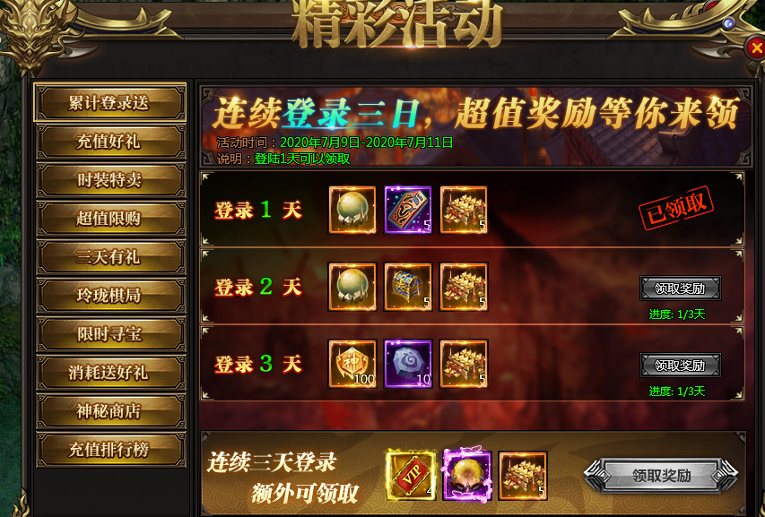 活动说明:活动期间,每天登陆即可领取奖励,连续三天更有额外奖励