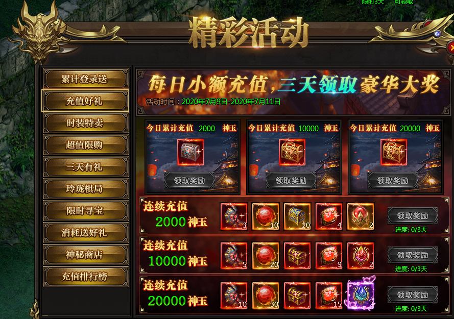 活动说:每日充值可以领取充值宝箱,连续三天充值更有额外极品奖励