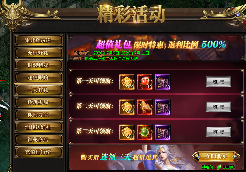 活动说明:一次购买,未来三天每日皆可领取极品奖励,助力成神