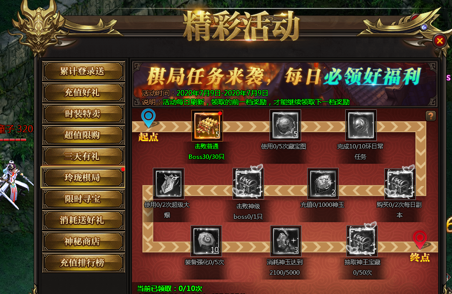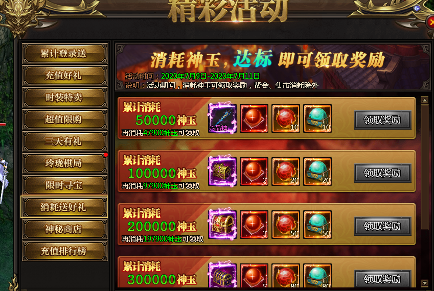 活动说明:活动期间,消耗神玉可以领取奖励,帮会、集市消耗除外