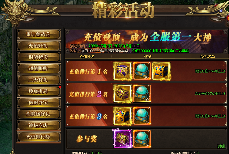 活动说明:名动本服,充值达到100000神玉即可参与排行,前三名均可获得极品自选宝箱。充值达到50000神玉即可获得参与奖。奖励会在活动结束后通过邮件发放