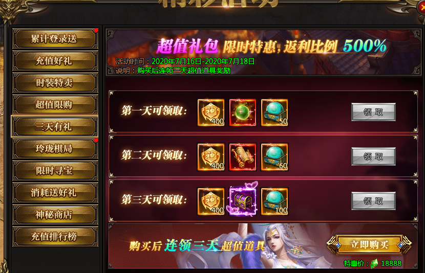 活动说明:一次购买,未来三天每日皆可领取极品奖励,助力成神