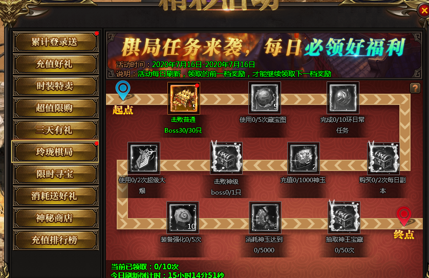 活动说明:神王宝藏限时发放极品装备、神器等,全服寻宝达到一定次数可获得保底奖励