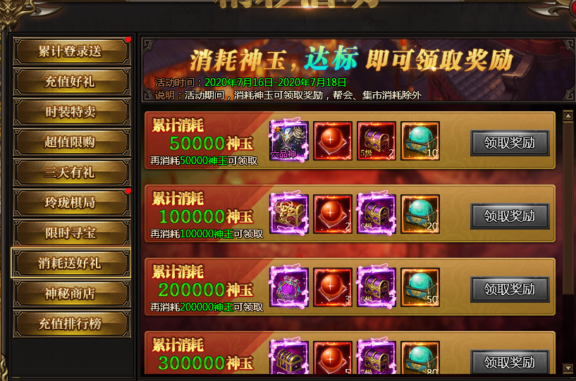 活动说明:活动期间,消耗神玉可以领取奖励,帮会、集市消耗除外