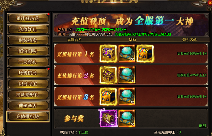 活动说明:名动本服,充值达到100000神玉即可参与排行,前三名均可获得极品自选宝箱。充值达到50000神玉即可获得参与奖。奖励会在活动结束后通过邮件发放