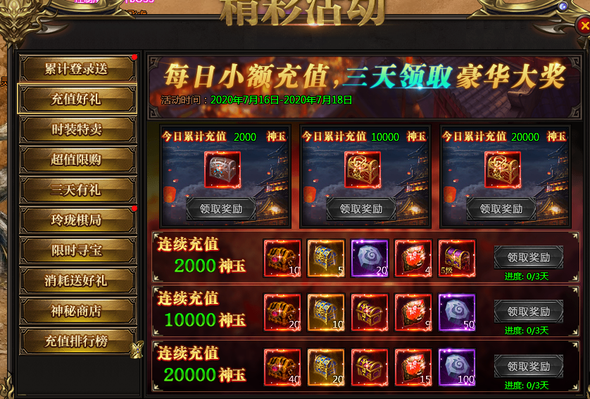 活动说:每日充值可以领取充值宝箱,连续三天充值更有额外极品奖励